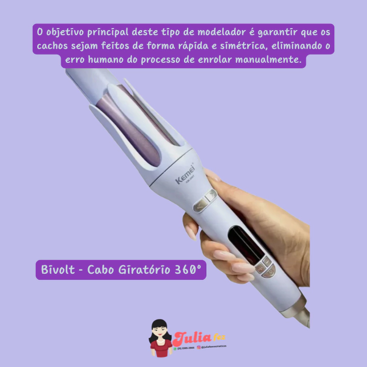 | Tipo de Modelador | Automático (Auto-Curl): O aparelho puxa a mecha de cabelo para dentro de uma câmara de cerâmica aquecida, enrola e segura por um tempo pré-determinado, soltando o cacho pronto. |