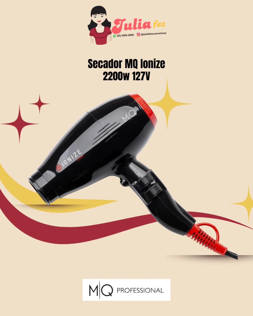 Secador De Cabelo Profissional Ionize 2200w 127v MQ PROFESSIONAL É A Escolha Ideal Para Quem Busca Performance E Sofisticação Na Finalização Dos Cabelos. Com Potência De 2200 Watts, Proporciona Secagem Rápida E Eficiente, Garantindo Brilho E Maciez Excepcionais.
